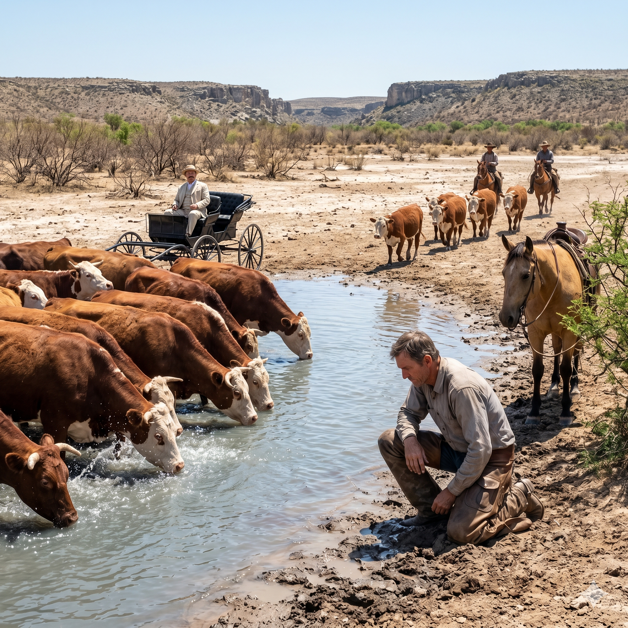 When Gideon arrived at the edge of the newly formed lake, Beauregard was already there, sitting in a lacquered buggy, a smug, triumphant smile plastered beneath his manicured mustache. Thousands of Cross-Iron cattle were plunging into the water, drinking greedily, their muzzles buried deep in the rushing current.